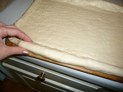 What a clever idea Pizza Hut came up with when they started putting cheese into the crust. I always thought the crust was the best part anyways, but now, even folks who didn't eat the crust would want to eat it! So string cheese gets rolled into the crust. I only do two sides, not all the way around. You could do it in a round pizza too, just cut slits into cheese so it goes around the curve.